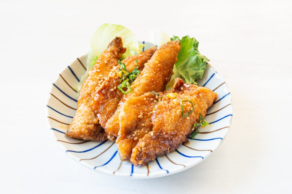 - 水分を切って片栗粉をまぶし、フライパンに油を入れて熱し、塩さばを入れて火が通るまで揚げ焼きにする。